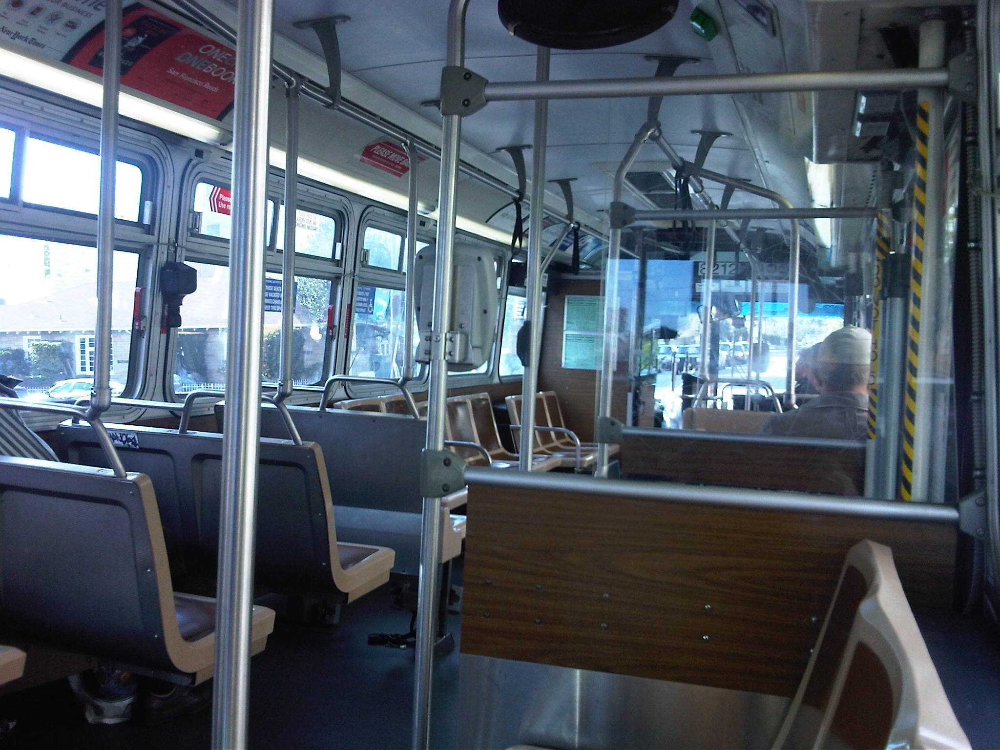Another look at the interior of a Muni bus. Although the bus appears to be old, it is clean/tidy. There are the occasional vandalism and there are signs asking passengers to report incidence of vandalism on the bus. There are also signs stating that conversations may be recorded and that the bus is under video surveillance. These seem to be standard security features of public transport in the US especially after the incidents of 9/11. Such information is welcome considering everyone would prefer to travel safely.