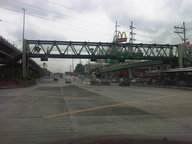 Overpass across Tandang Sora where the middle portion descends under the T. Sora flyover in an unusual design that calls to mind the adjustments made for pedestrian facilities constructed across EDSA, and above or below the MRT3 alignment. Notice the countdown timer for the signals at this major intersection.