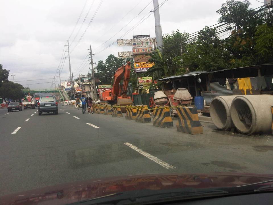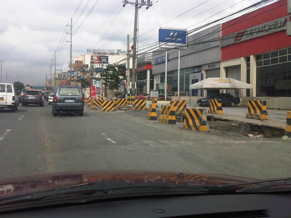 Partly completed works along Marcos Highway westbound just after the junction with Felix Ave./A. Tuazon Ave. and across from Sta. Lucia Grand Mall