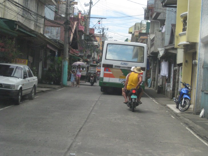 This narrow street is actually part of the national road that’s well within Lucban town proper. There are no sidewalks, much on-street parking. and tricycles and motorcycles actively mingling with through traffic. Notice the bus already encroaching upon the lane for opposing traffic. Note, too, the two pedestrians (one is a child) walking along the carriageway with a tricycle right behind them.