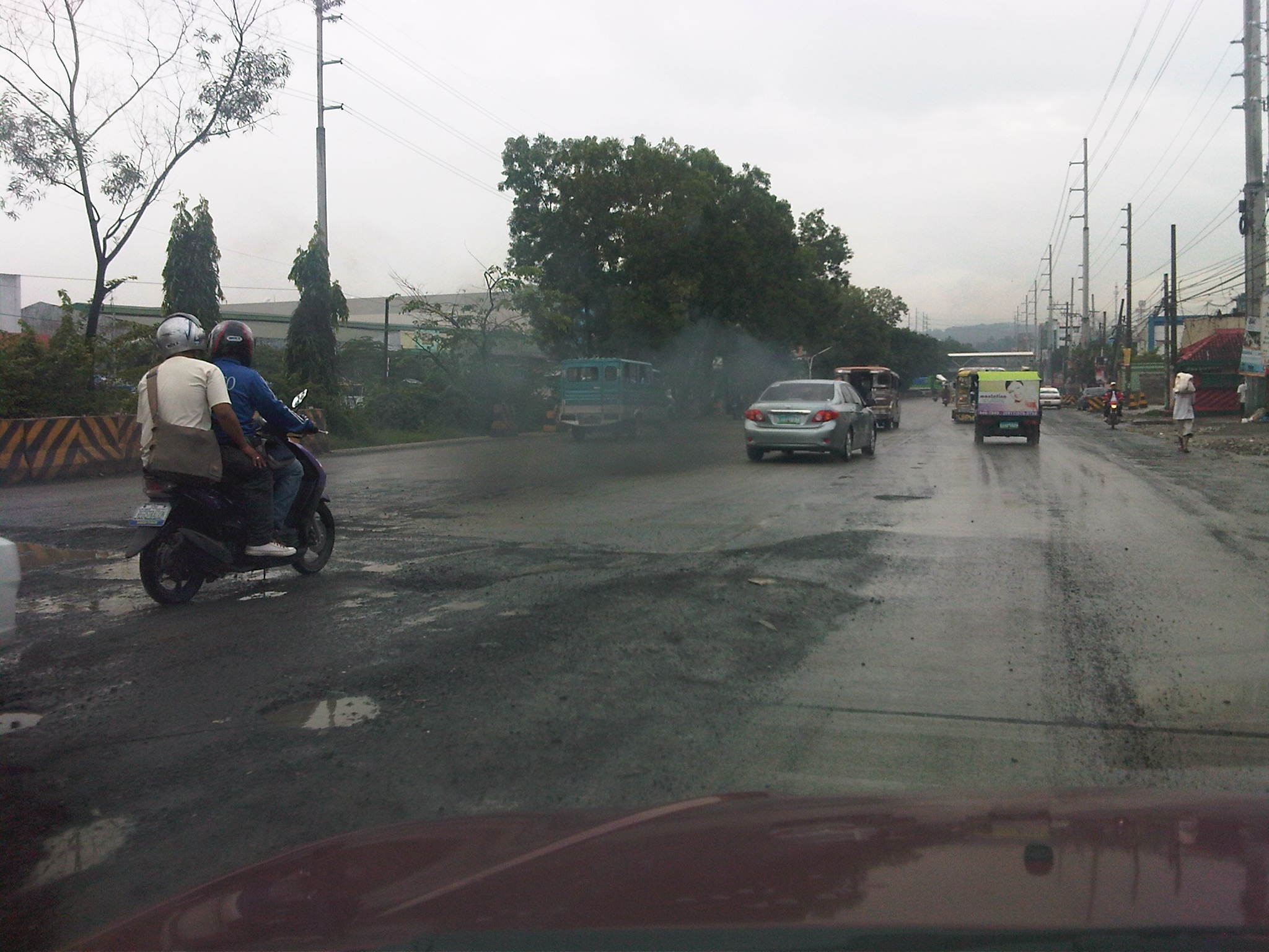 Unfinished road works near Kingsville Gate along Marcos Highway eastbound – bad road conditions lead to congestion as vehicles are forced to slow down due to the potholes and uneven pavement surface.