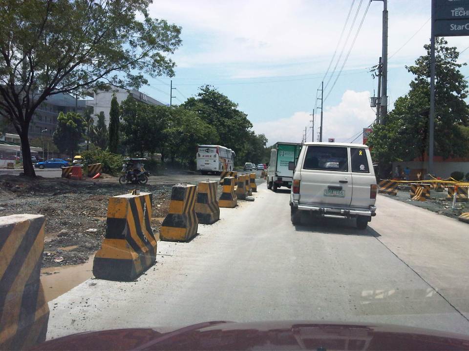 Unfinished section along Marcos Highway westbound – the number of lanes are reduced from 5 to 2, drastically reducing capacity and causing serious queuing due to the shockwave resulting from the bottleneck.
