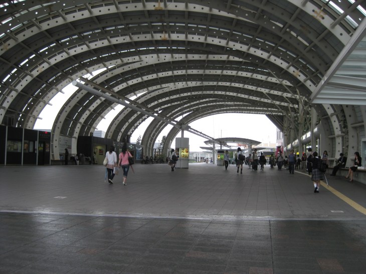 This the view of a pedestrian approaching the Saitama Shintoshin JR station. Shops are located along the right side of the promenade while the arches form the roof structure of the station, reflecting the modern architecture of the transit station.