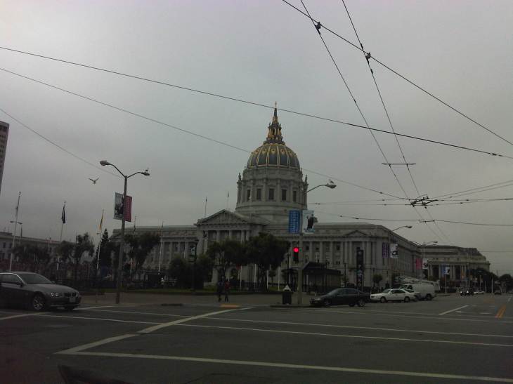 Overhead cables seem to be everywhere including the streets around the San Francisco City Hall located at the Civic Center. This is a photo of the intersection of McAllister and Polk Street.