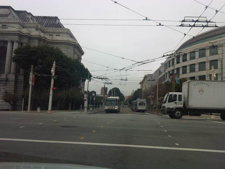 Where buses turn, cables may also be found above. This is the junction of McAllister and Van Ness Avenue. That’s the Herbst Theater building on the left, which houses the Museum of Performance and Design, and the California Public Utilities Commission on the right. Those are two buses, one trolley and the other natural gas-powered in the middle of the photo.