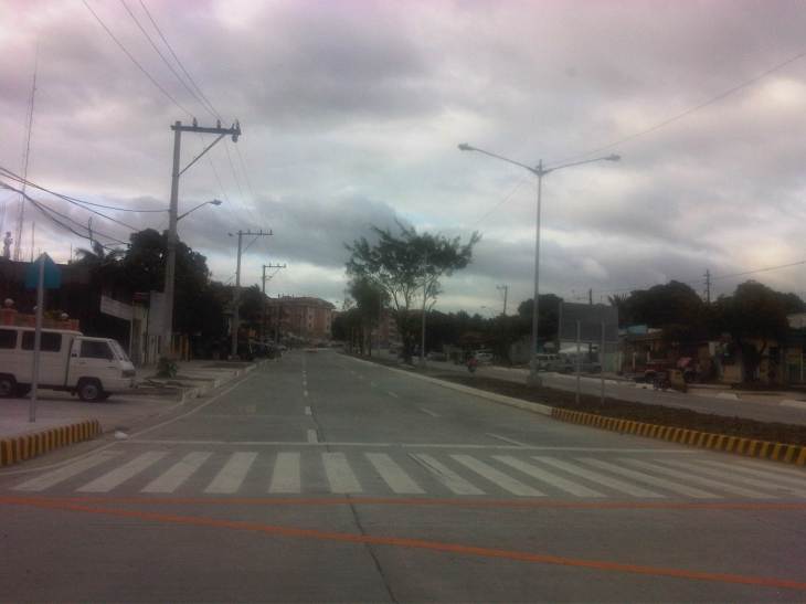 Approach to intersection from Quirino Highway. Also visible in this photo are residential buildings of the San Benissa Garden Villas