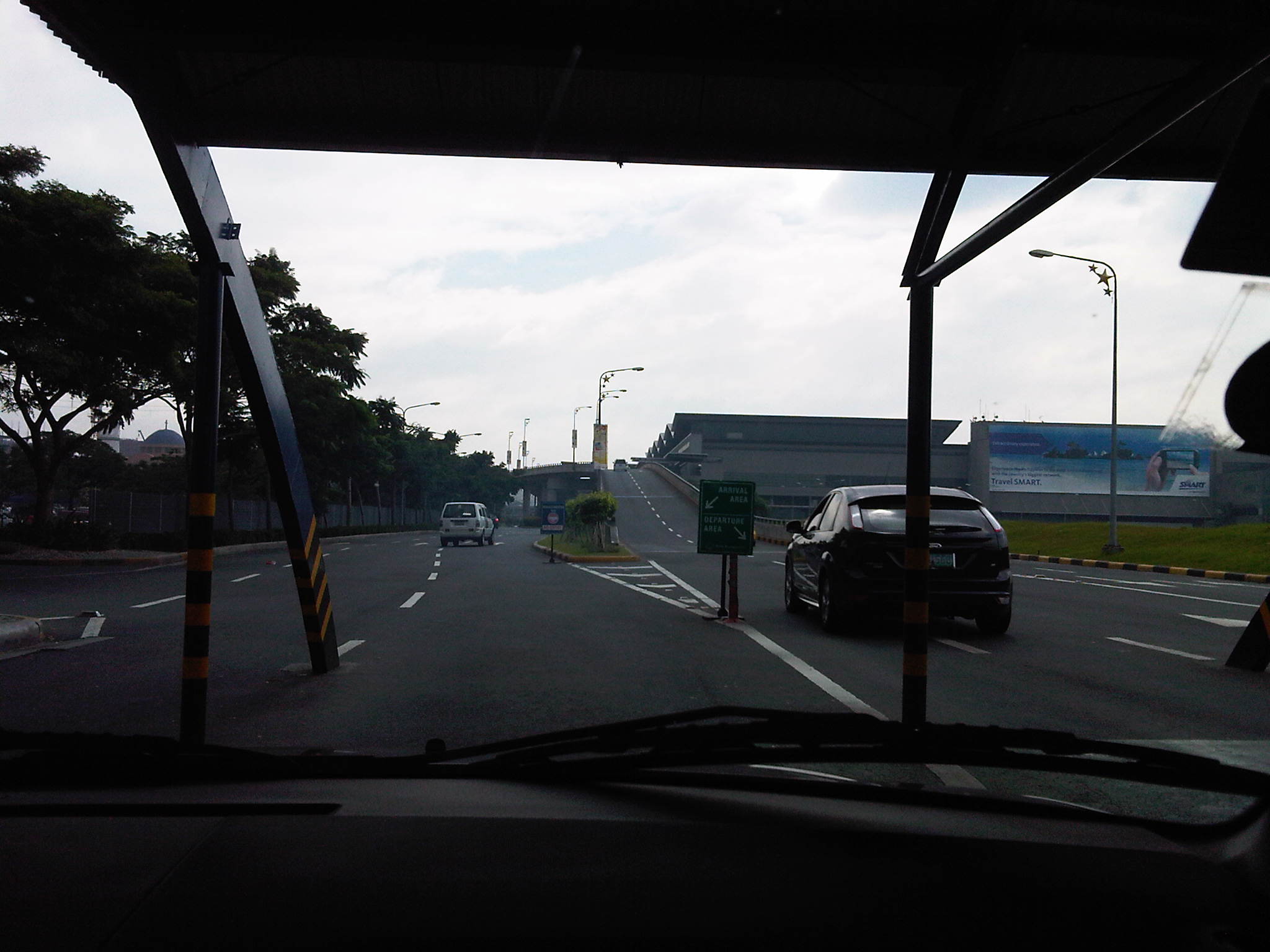 Turning towards the exit from the parking facility, one is greeted by more vehicles parked along the curbside (both sides of the driveway, actually). The fence separates this driveway from another that leads to the ramp to the multilevel parking building that is visible on the right side of the photo. This latter driveway also has vehicles parked along its length, which is allocated for overnight or long term parking. Above is the ramp from the departure level.