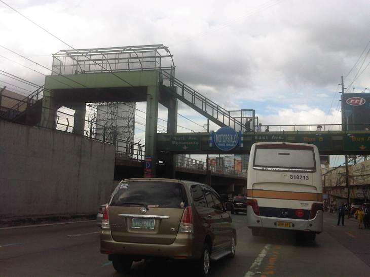 Motorcycle lane ascends the flyover crossing the junction with Quezon Avenue – the lane is again the middle of three lanes. That’s the EDSA-MRT Quezon Avenue station on the left and downstream in the photo and the Centris mall on the right.