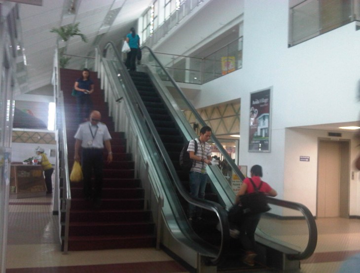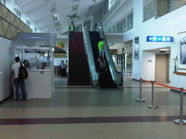 Terminal fee counter and escalator and stairs to the departure level. Domestic flight passengers are charged PhP 200 each to cover airport maintenance and security