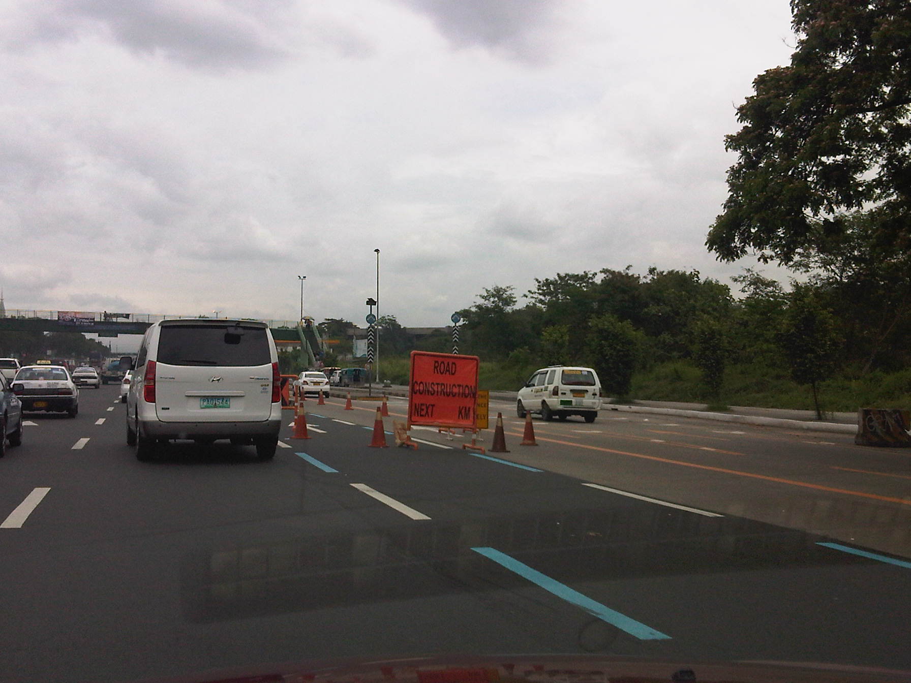 Under construction – tarpaulin sign and traffic cones mark the beginning of an area cordoned for the construction of the lane separators. The separators are supposed to be built along both directions of Commonwealth and may stretch all the way to Fairview. These should also aid traffic enforcers in apprehending PUVs traveling outside their designated lanes.