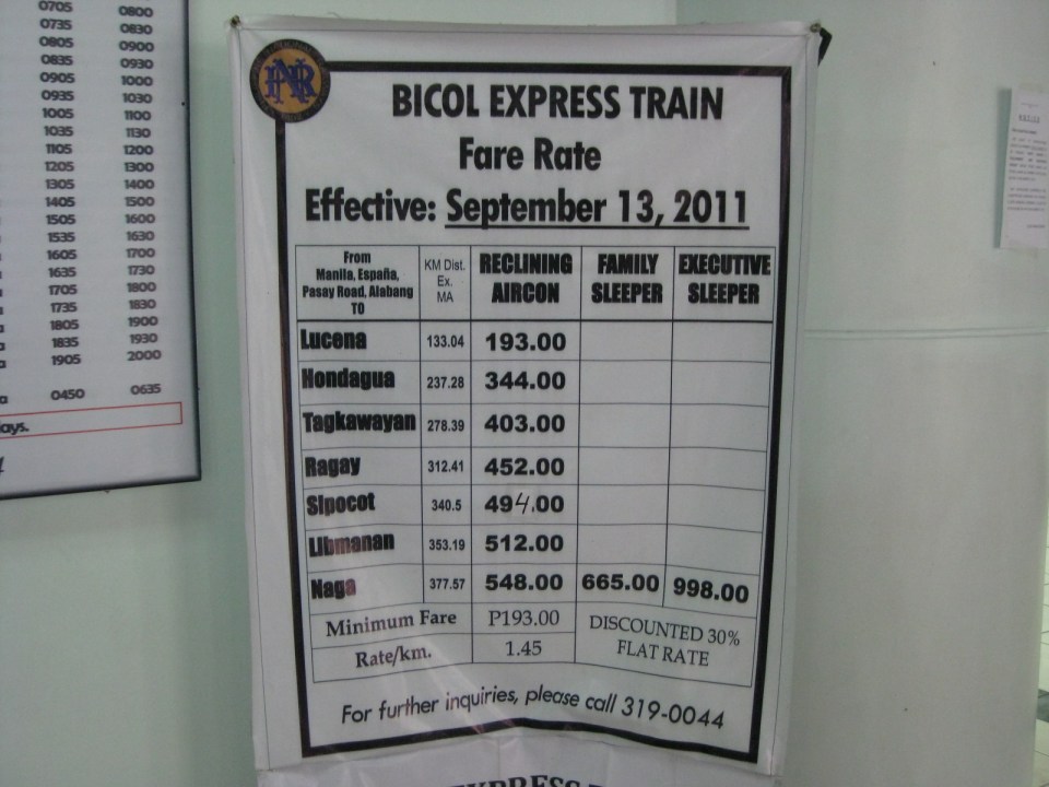 Fare table for the resurrected Bicol Express – family and executive sleepers were supposed to start operation last March 16. We were told that the PNR hosted representatives of travel/tourist agencies to an exclusive initial run of the sleeper and recliner cars to Bicol and back. This was part of the promotion of rail services to travelers especially as the summer months are approaching.