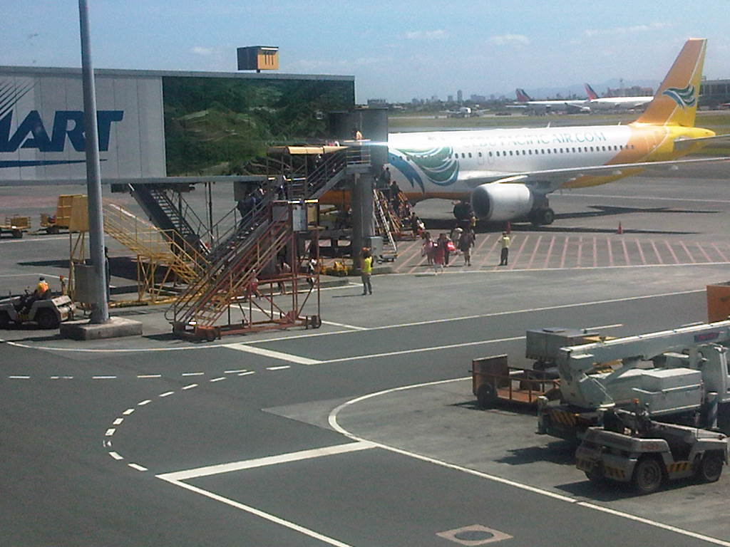Passengers deplaning from the Cebu Pacific A320 aircraft – the plane was already docked for it to be served by the air bridge but it tool about 20 minutes before the flight attendant informed passengers that the aircraft had to be re-positioned to allow for the stairs to be brought alongside the aircraft. It was also announced that the reason for this was because there was no operator available for the air bridge.