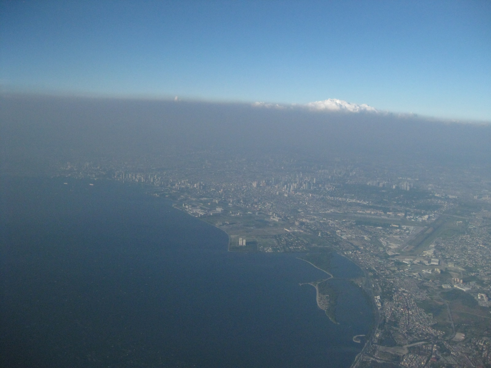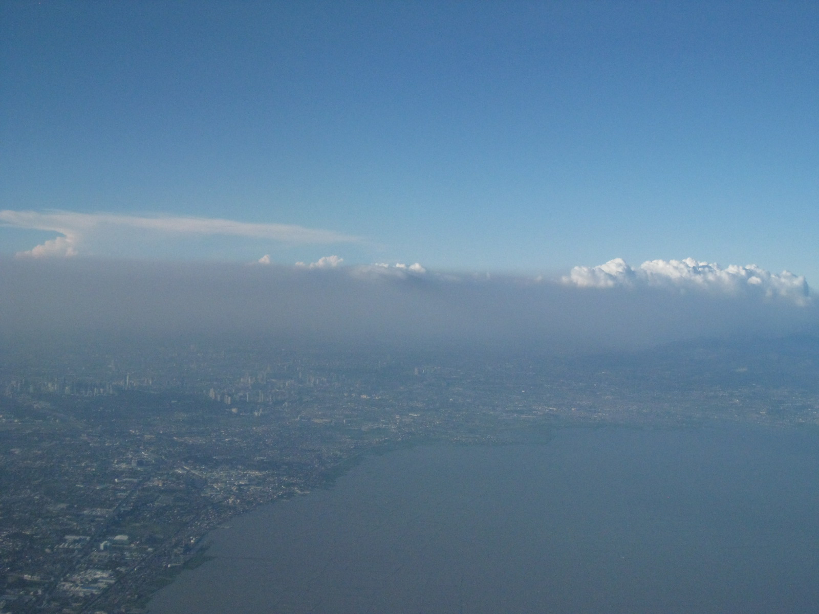 I like to take aerial photos of islands and distinguishing formations or features on the land below. Among those I’ve been able to catch on photo on clear days are Mayon Volcano, Taal Volcano, the Chocolate Hills, Cagayancillo, and Corregidor Island. I took some snapshots while our plane was approaching Metro Manila around 5PM. This time, what caught my attention was not the any land feature but something above it – the smog that covered Metro Manila and its surrounding areas.