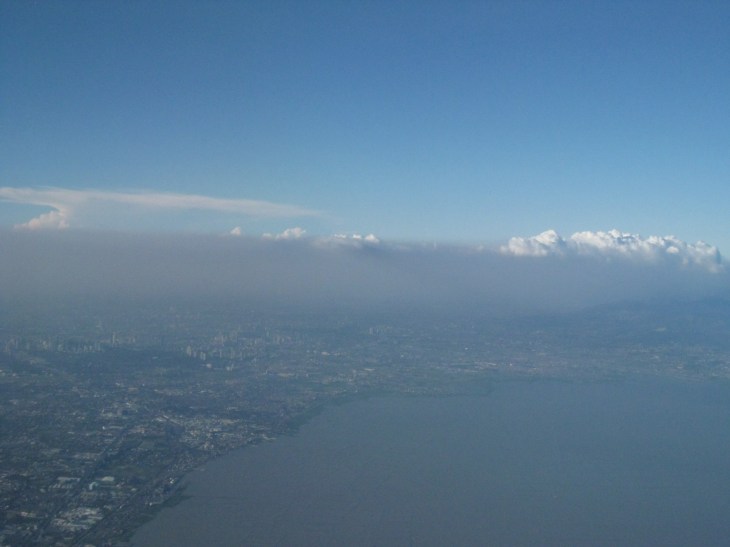 I like to take aerial photos of islands and distinguishing formations or features on the land below. Among those I’ve been able to catch on photo on clear days are Mayon Volcano, Taal Volcano, the Chocolate Hills, Cagayancillo, and Corregidor Island. I took some snapshots while our plane was approaching Metro Manila around 5PM. This time, what caught my attention was not the any land feature but something above it – the smog that covered Metro Manila and its surrounding areas.