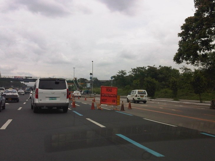 Under construction – tarpaulin sign and traffic cones mark the beginning of an area cordoned for the construction of the lane separators. The separators are supposed to be built along both directions of Commonwealth and may stretch all the way to Fairview. These should also aid traffic enforcers in apprehending PUVs traveling outside their designated lanes.