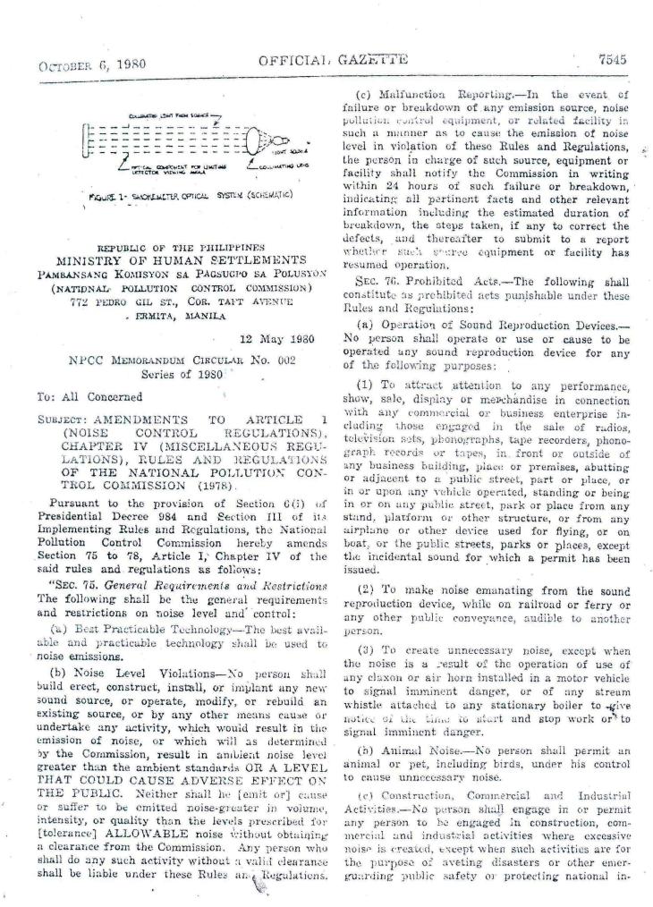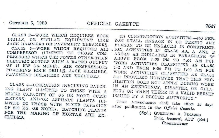I reproduce below the three pages of what was the National Pollution Control Commission’s Memorandum Circular No. 002, Series of 1980, as published in the Official Gazette of the Republic of the Philippines, which until now serves as the basis for noise standards in the country. Recent initiatives led by the DENR’s Environmental Management Bureau seeks to update/revise these standards and a draft has been circulated to members of an inter-agency committee and industry. Perhaps our local governments could take a look at laws that are often set aside in part because of a lack of instruments to be able to quantify noise. I think curbing noise pollution should significantly improve our quality of life and would have positive impacts to our health.