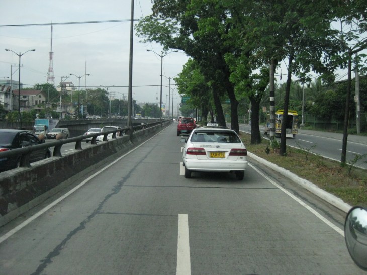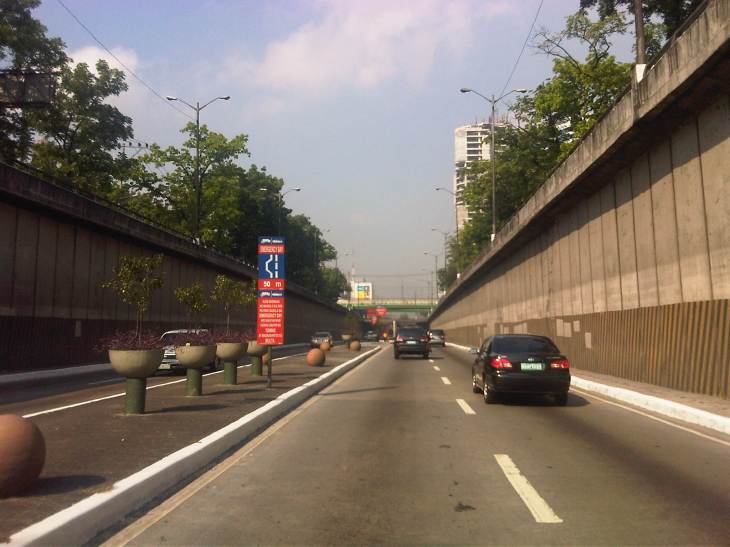 Vehicles approaching Agham Road – the vehicles on the left side are already along the underpass. The 2-lane service road is on the right