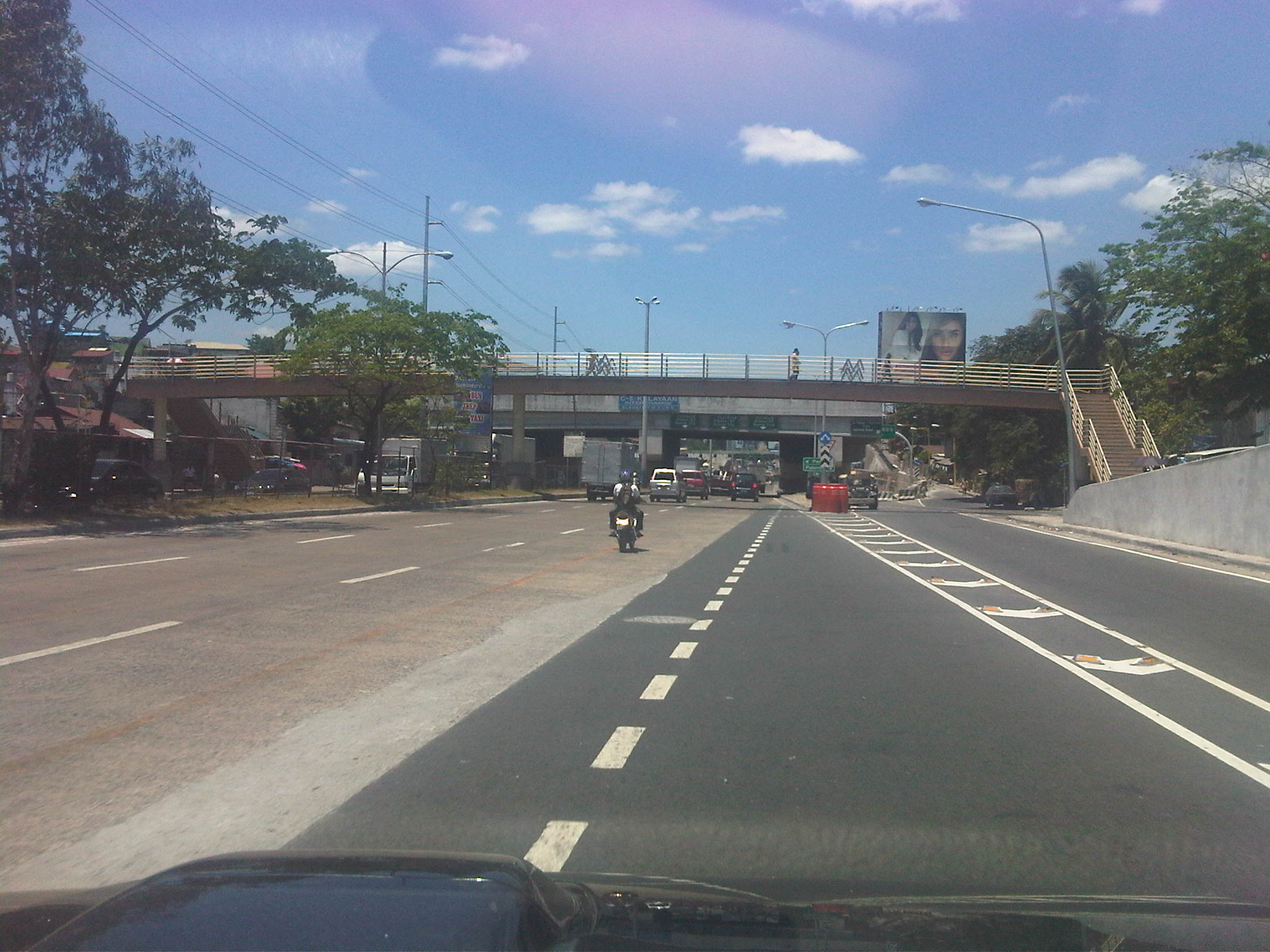 Approach to the new overpass – the chevrons are supposed to guide motorists as to the separation of traffic lanes. The lane to the right leads to the service road for Market! Market! and connects with C5 southbound.