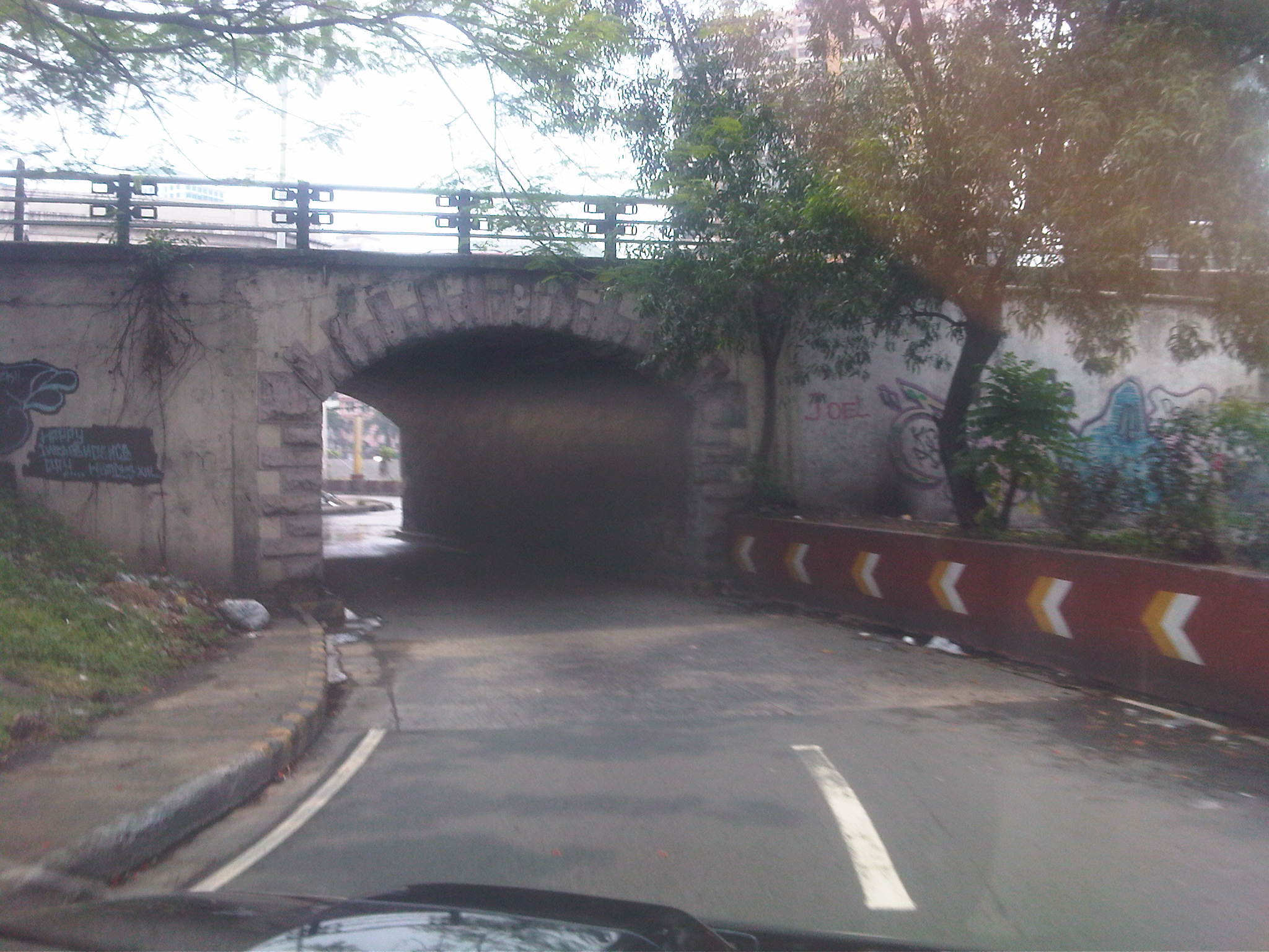Taking a turn – turning from the approach towards the riverside portion of the Muelle del Rio, one can see the bridge for the LRT Line 1 and trees where homeless people usually take shelter. The driveway under the bridge is for a public transport terminal occupying the area under the bridge.