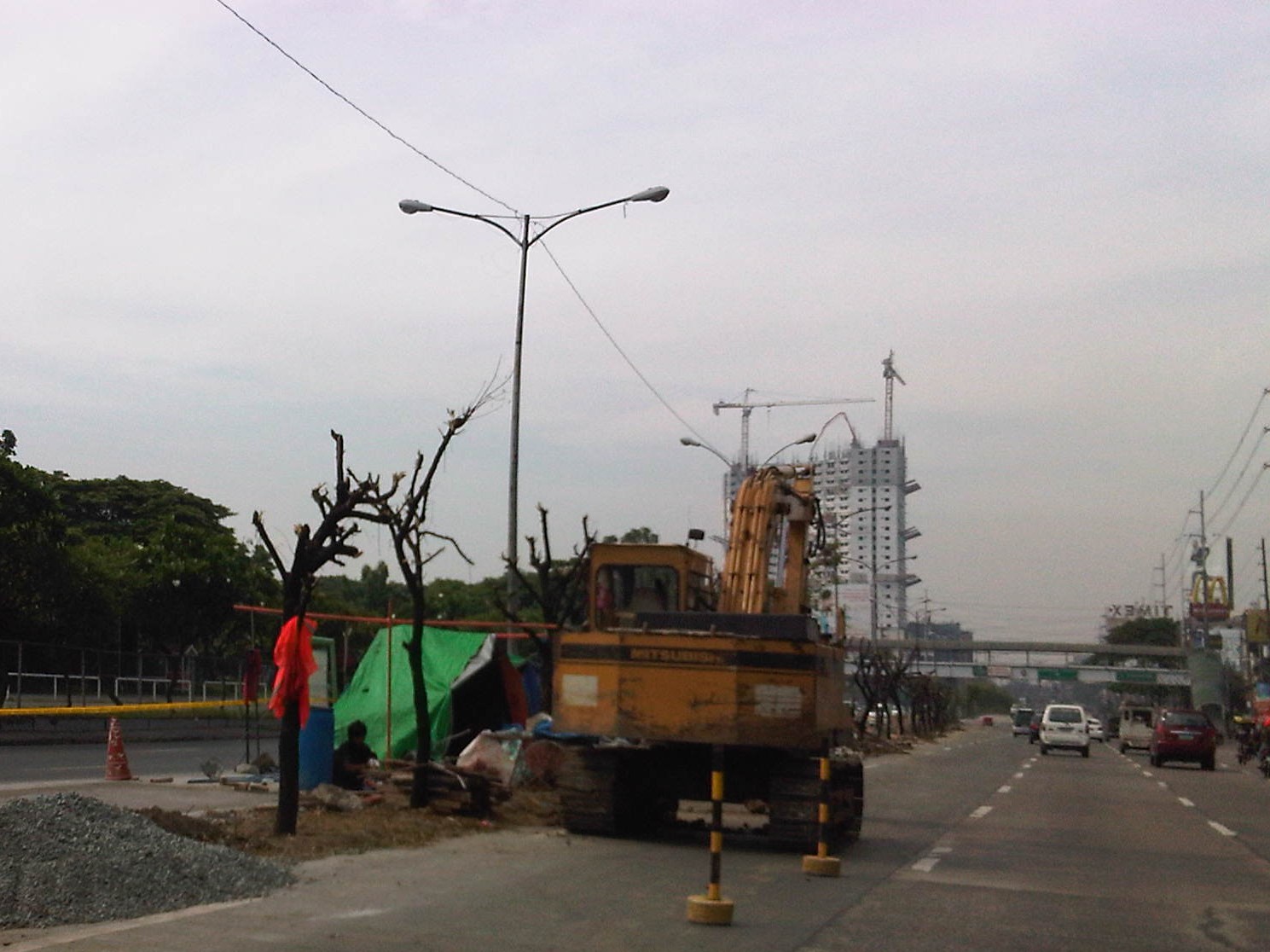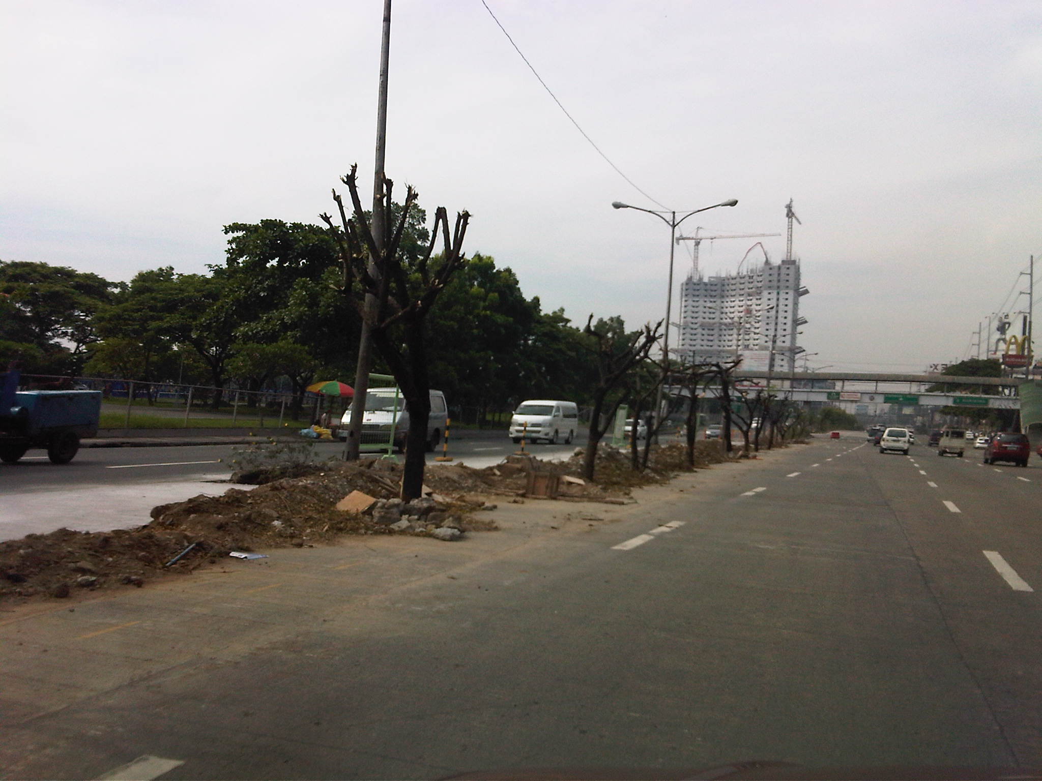 This morning (Sunday, May 20), as I drove along the same way I saw that the trees’ branches have been cut off. I am not a botanist or an expert with flora but perhaps this was done to allow the trees to recover? The optimist in me says leaves will eventually sprout from the stubs much like they did for the trees removed from the Katipunan service road about a decade ago that were transferred to the Marikina Riverbanks, many of which lived only to perish from Ondoy’s floods in 2009. The following photos are what’s left of the median island trees of Katipunan.