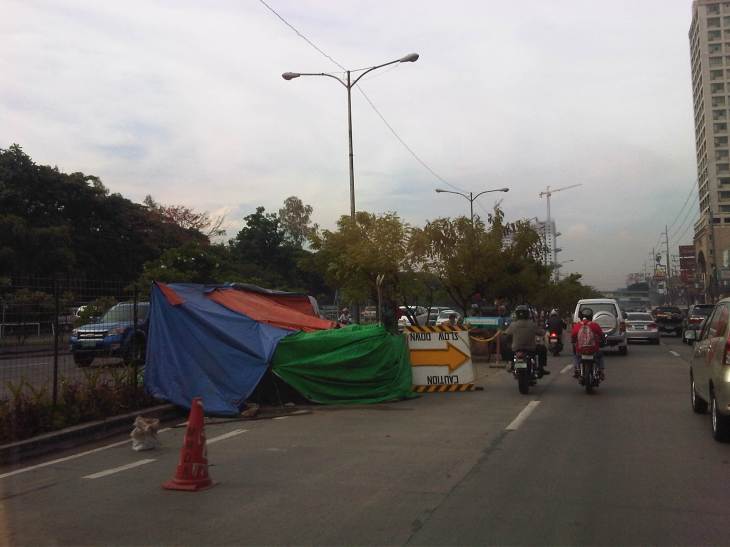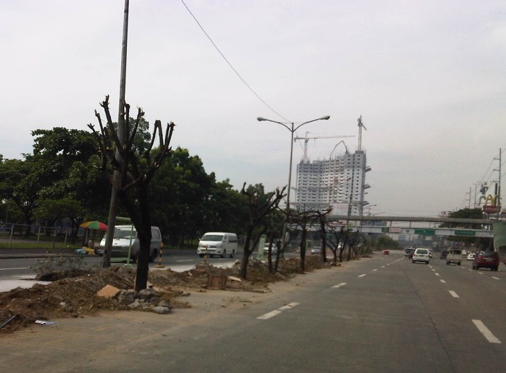 This morning (Sunday, May 20), as I drove along the same way I saw that the trees’ branches have been cut off. I am not a botanist or an expert with flora but perhaps this was done to allow the trees to recover? The optimist in me says leaves will eventually sprout from the stubs much like they did for the trees removed from the Katipunan service road about a decade ago that were transferred to the Marikina Riverbanks, many of which lived only to perish from Ondoy’s floods in 2009. The following photos are what’s left of the median island trees of Katipunan.