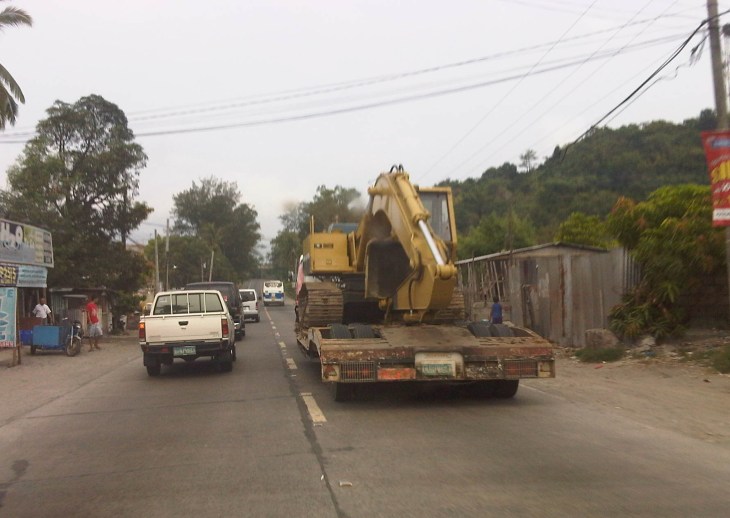 Rounding the curve – some congestion due to the slow-moving trailer carrying a backhoe/excavator