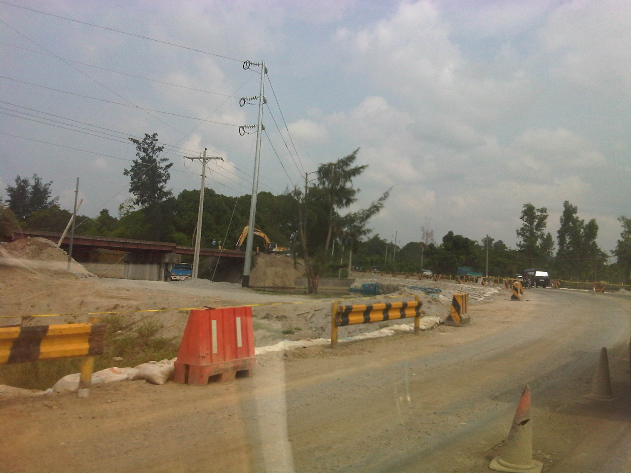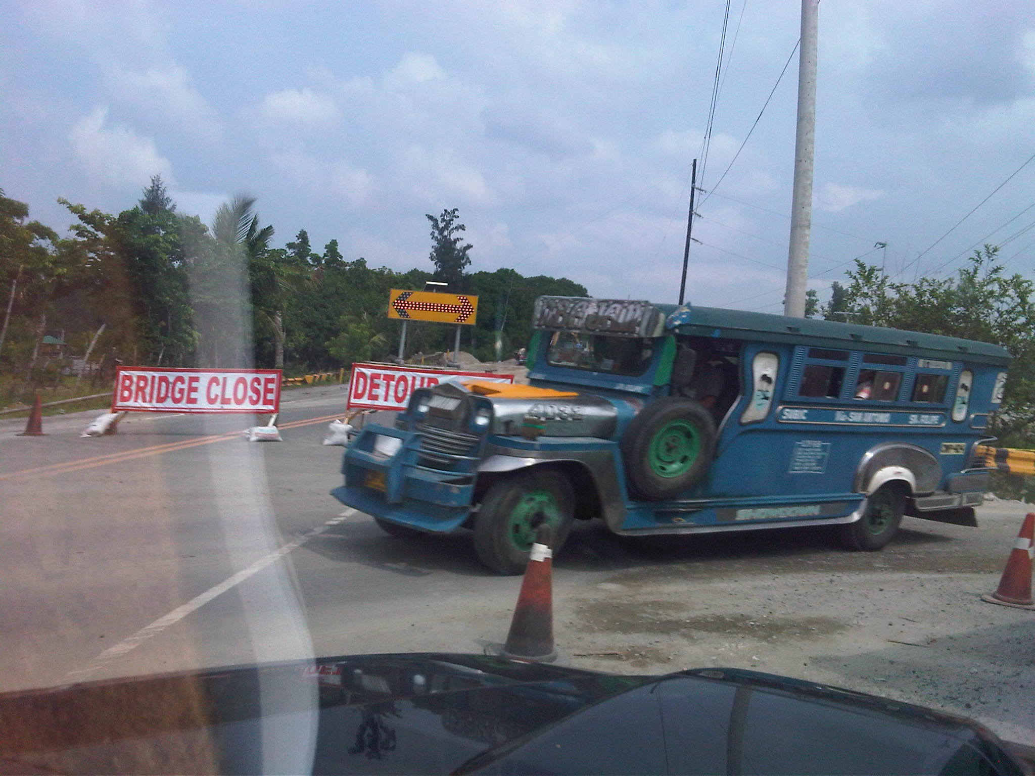 Blocks – signs block the way towards the bridge under construction along the highway while a jeepney emerges from the temporary diversion road.