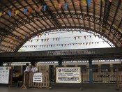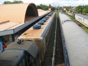 View from the top – there are pedestrian overpasses crossing the tracks for access to platforms and other parts of the station. Visible in the photo are discarded bogeys and the blue car that is an executive class coach with reclining seats.