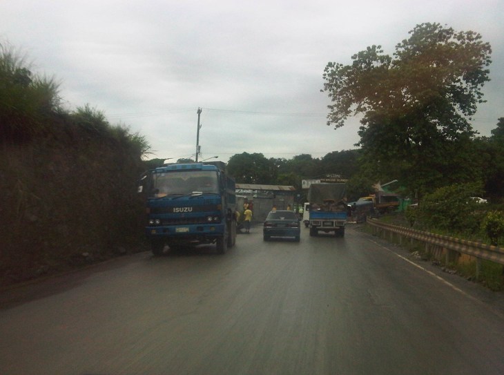 The road has poor drainage along many of its sections including this section near a gas station where muddy water pools in the middle of the road. Such instances induce drivers and riders to encroach upon the opposing lane as shown in the photo above.