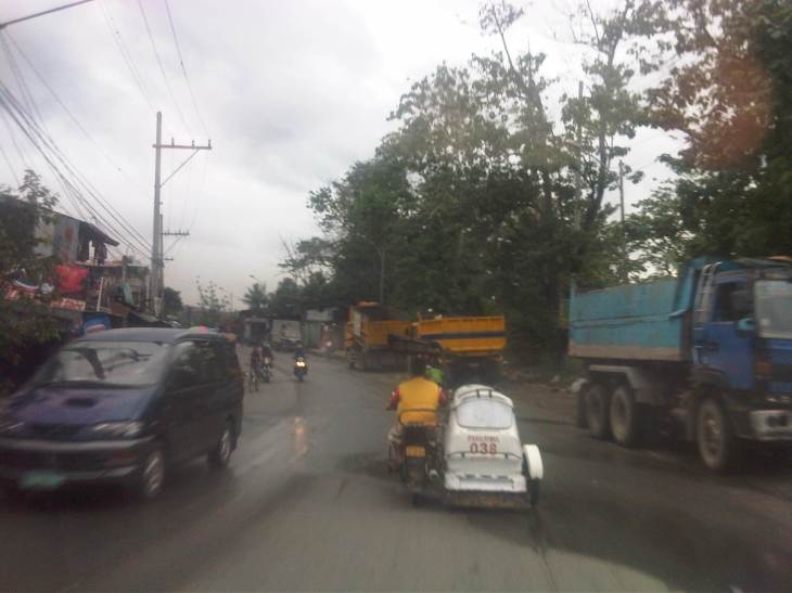A busy section complicated with parked vehicles along the roadside and the proliferation of tricycles and motorcycles in this densely populated (and vote-rich) part of Quezon City.