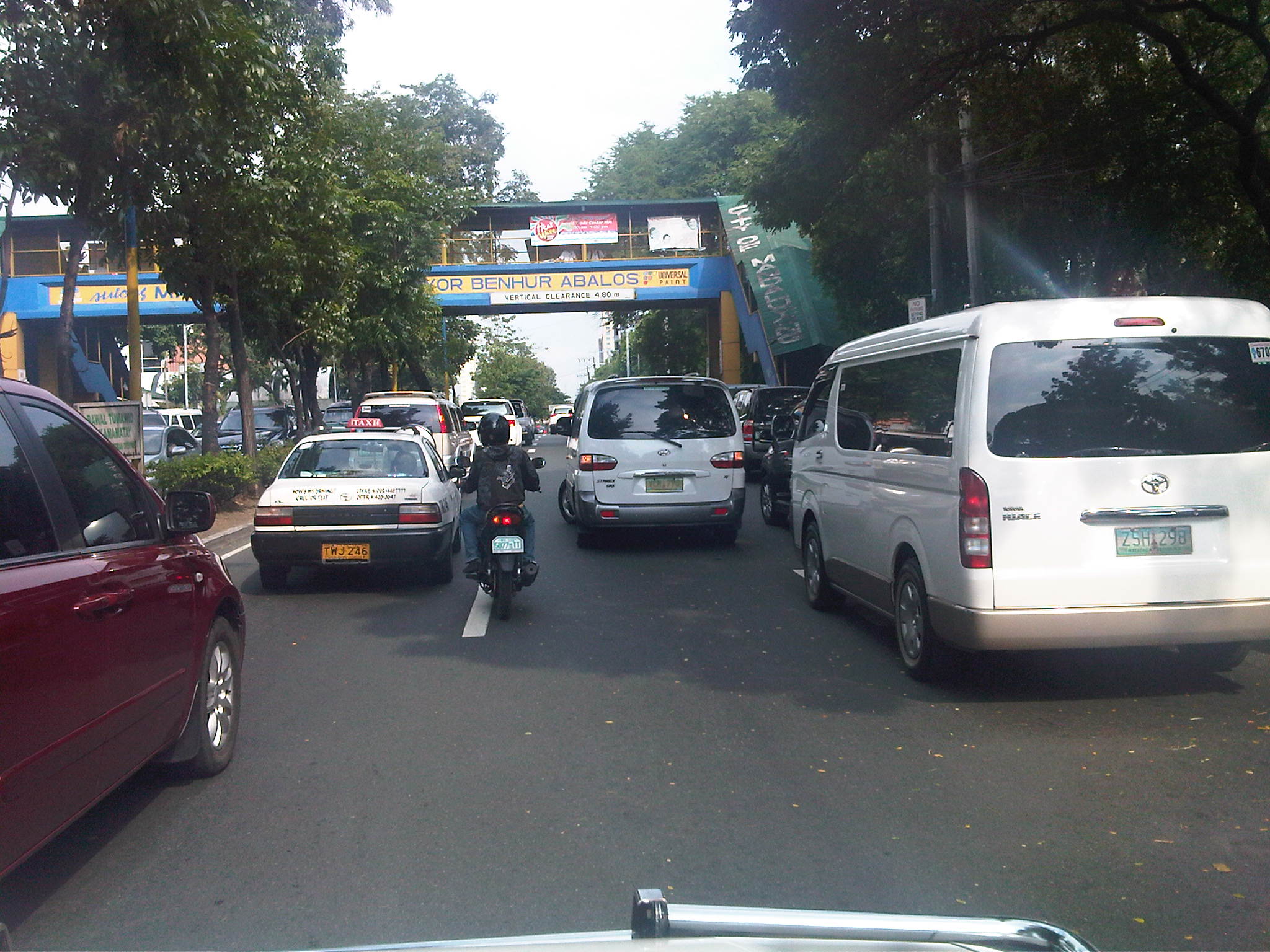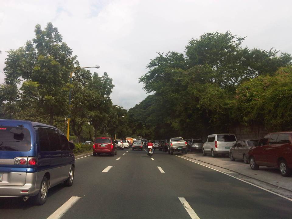 Parked vehicles on the sidewalk are seen as we approached the tail of a very slow moving platoon owing to the congestion generated by an exclusive school.