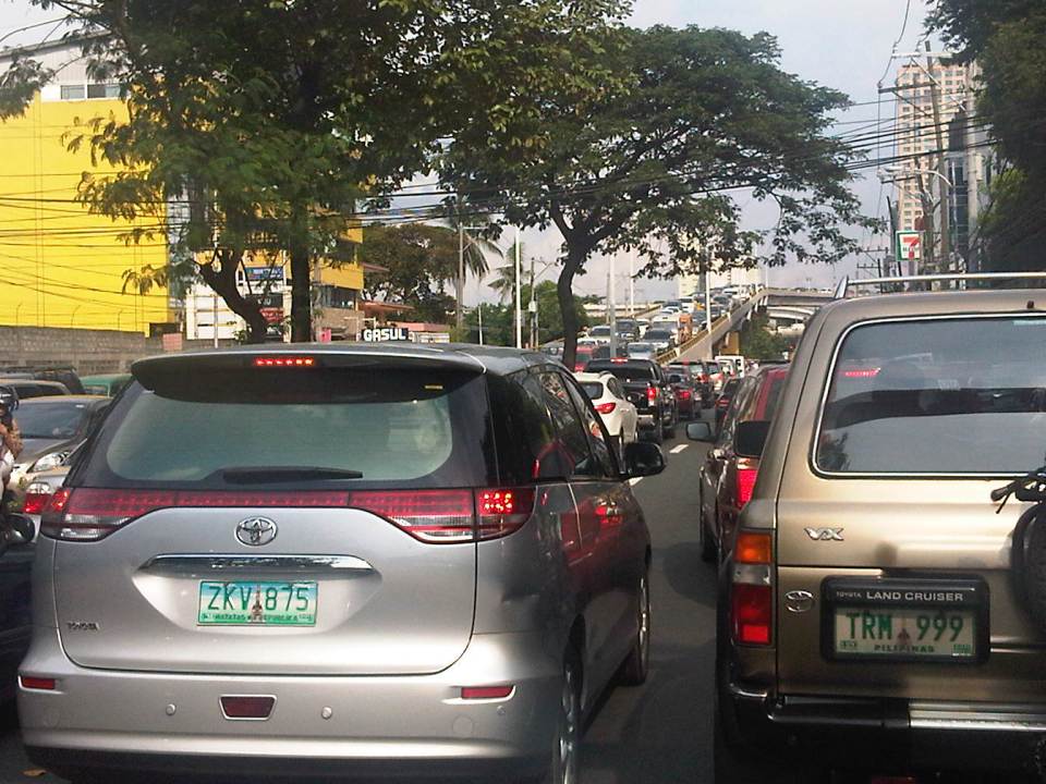 Traffic jam with road capacity reduced by the parked and standing vehicles along the EDSA-bound side of Ortigas Ave. The trees are witnesses to the chronic traffic jams and help alleviate their impacts by absorbing emissions from the vehicle.