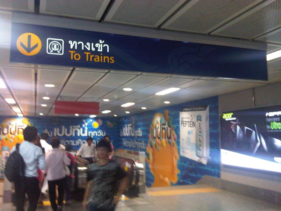 Directional sign guides people coming from the Skytrain platform to the MRT, Bangkok’s lone subway line