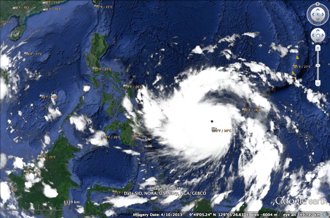 Lives will be at a standstill for many parts of the Philippines when super typhoon Yolanda (International name: Haiyan) finally makes its presence felt as it takes a path through the central Philippines from tonight until Saturday. The typhoon is already a Category 5 and packing winds above 250 kph. It will be a destructive system as it plows through areas already saturated by rains from a storm that preceded it just a few days ago. The image below is from Google Earth, showing the approaching typhoon as of early morning of November 7 (Philippine time).