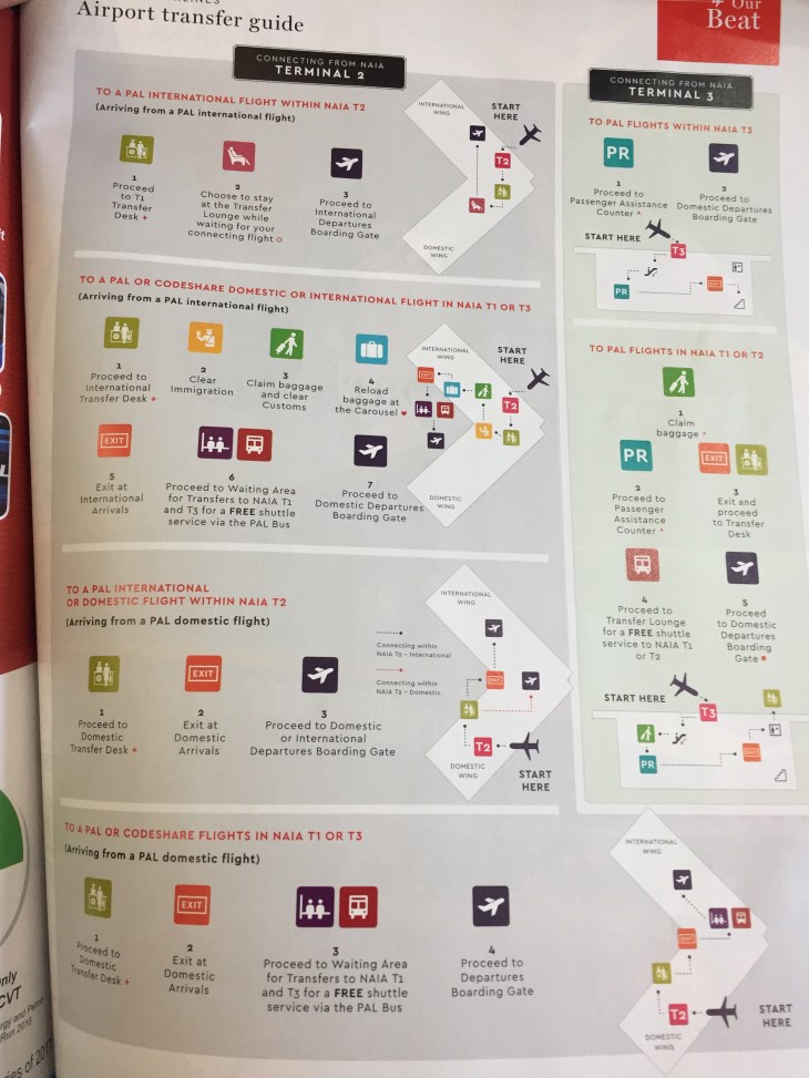 I was able to get the following photos of a couple of pages from the Philippine Airlines (PAL) inflight magazine Mabuhay. The photos show an airport terminal transfer guide for the Ninoy Aquino International Airport (NAIA), which has 4 terminals. Since I get a lot of traffic and questions about terminal transfers in this blog, I thought it practical and informative to just post these here for everyone’s benefit.