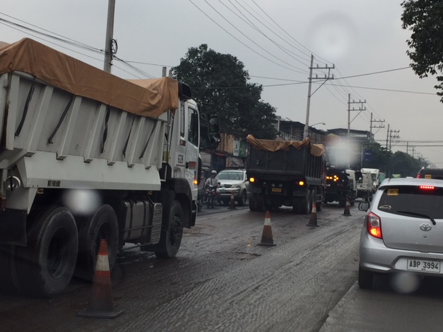 Dump trucks lined-up carrying aggregates for the asphalt overlay; occupying one lane of Ortigas Avenue Extension.