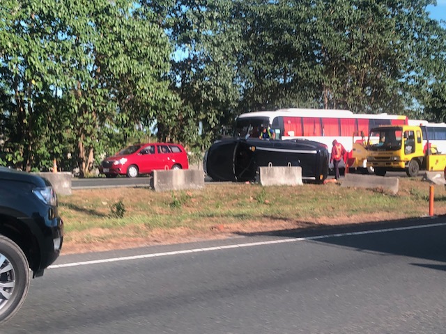We were returning from Clark last week when we chanced upon a crash site along the North Luzon Expressway (NLEX). We already suspected this as we approached a build-up of traffic along the southbound direction where there is usually free-flowing traffic. Here are some photos of an overturned vehicle on the median. It seems like it is the only vehicle involved as there were no other vehicle in the vicinity that could have been involved. However, it is possible that there was another vehicle involved in a situation where the overturned vehicle’s driver lost control after interacting with the other vehicle. Obviously both vehicles could have been traveling at high speeds (they are on an expressway) so this could have been an example where the combination of speeding and weaving in traffic led to an overturned vehicle (i.e., one lost control).