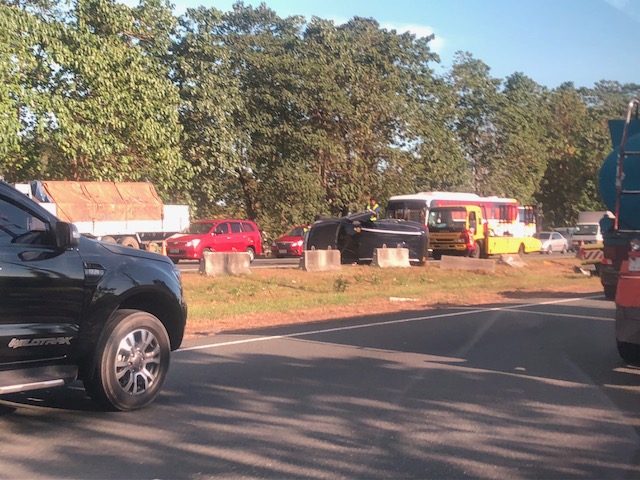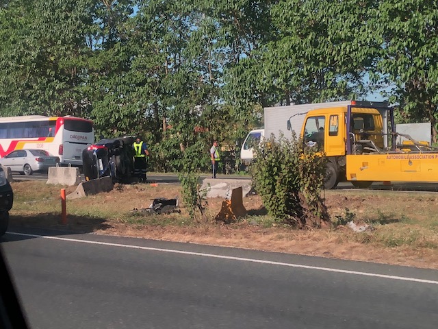 We were returning from Clark last week when we chanced upon a crash site along the North Luzon Expressway (NLEX). We already suspected this as we approached a build-up of traffic along the southbound direction where there is usually free-flowing traffic. Here are some photos of an overturned vehicle on the median. It seems like it is the only vehicle involved as there were no other vehicle in the vicinity that could have been involved. However, it is possible that there was another vehicle involved in a situation where the overturned vehicle’s driver lost control after interacting with the other vehicle. Obviously both vehicles could have been traveling at high speeds (they are on an expressway) so this could have been an example where the combination of speeding and weaving in traffic led to an overturned vehicle (i.e., one lost control).