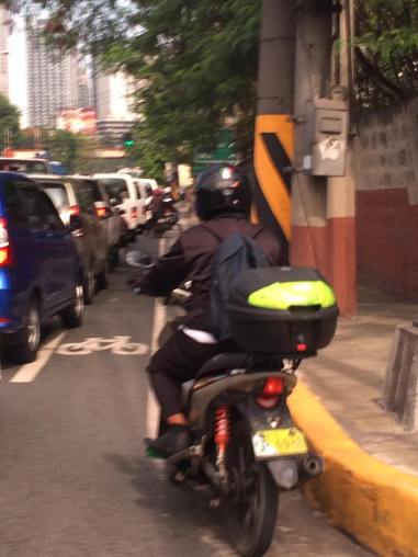 Motorcycles using the bike lanes along Ortigas Avenue. How do we make sure that spaces are utilised according to their intended users? How do we design these spaces to include elements that will deter such incursions?