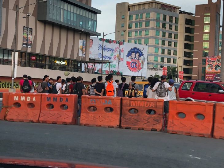 The photo shows people crowding the area at the U-turn slot in order to have a better chance at getting a jeepney ride. Many jeepneys turning here are actually cutting trips. So there are two clearly illegal activities going on here that the MMDA or Pasig City enforcers turn a blind eye to. The situation regarding the commuters is unsafe and requires attention. There is supposed to be a transport terminal across from the mall. And don’t mind the political ad (yes that stupid one in the background by an opportunist running for the senate).