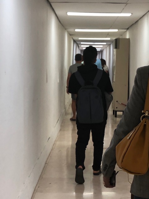 Descending the stairs or escalator to the arrival level and the baggage claim area