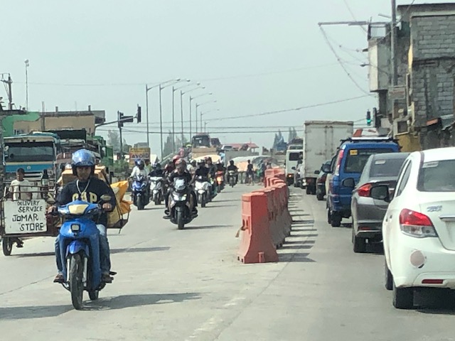 Orange barriers delineate opposing traffic at the Highway 2000 approach to Barkadahan Bridge. The intersection before the bridge is with the East Bank Road of the Manggahan Floodway.