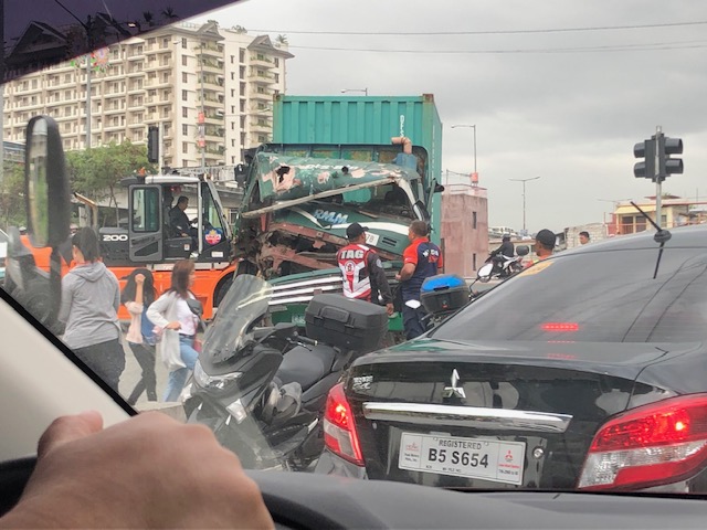 We were almost late for our flight the last Friday of November because of a road crash involving at least one truck at the intersection of Sales Bridge and the SLEX East Service Road.