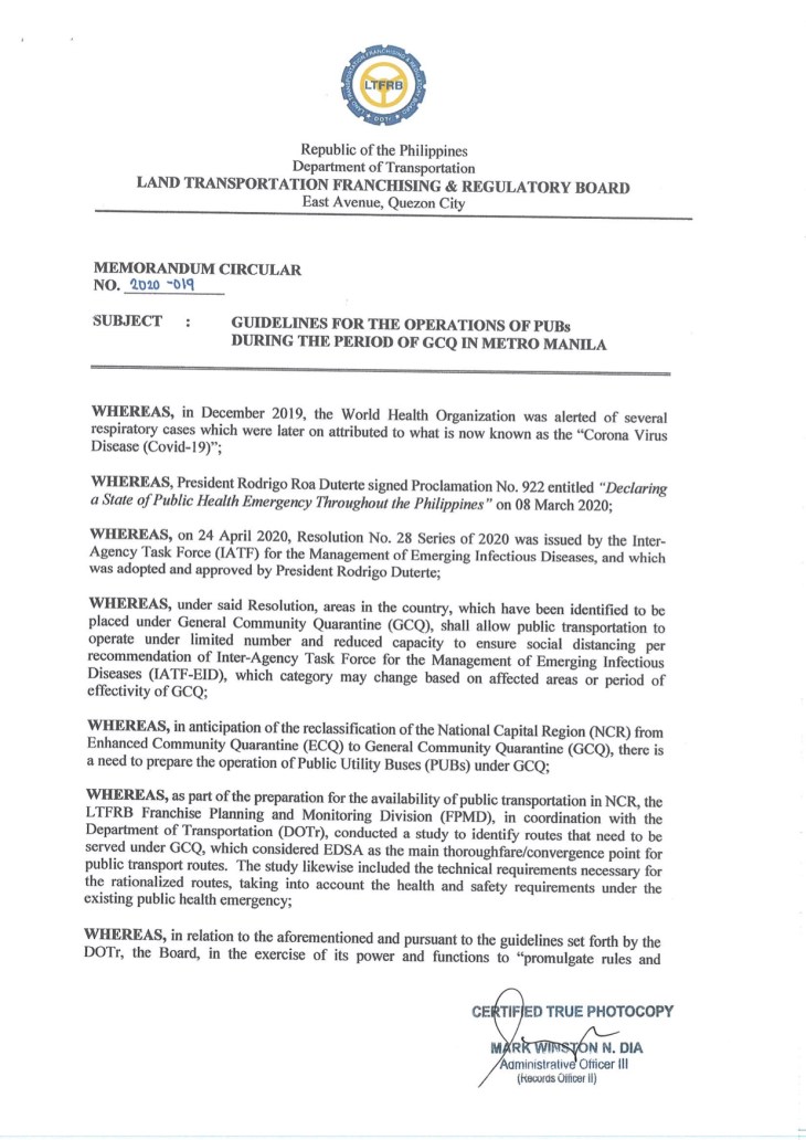 The following images show the full 19 pages of the Land Transportation Franchising and Regulatory Board Memorandum Circular No. 2020-019: Guidelines for the Operations of PUBs During the Period of GCQ in Metro Manila. Again, no comments for now as I post this for reference. I have not seen it posted on the LTFRB’s Facebook page yet but it is a public document and something that needs to be circulated for the benefit of the riding public.