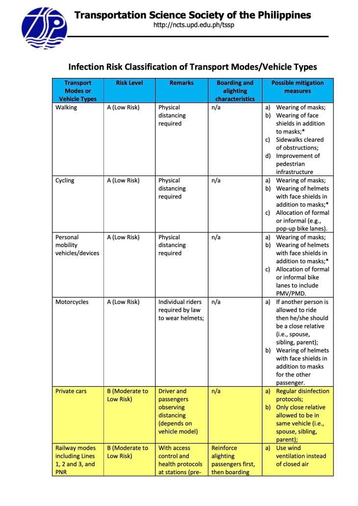 I posted about the work we have been doing to assess the infection risk (i.e., spread of COVID-19) for various modes of transport considering the transition of many areas including the National Capital Region (NCR) to the General Community Quarantine (GCQ). The work was undertaken through the Transportation Science Society of the Philippines (TSSP), which is under the umbrella of the Eastern Asia Society for Transportation Studies (EASTS). Here is the outcome in the form of an “Infection Risk Classification of Transport Modes or Vehicle Types” developed by a core group of public transportation and road safety specialists among its members: