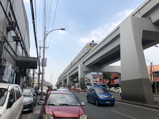 Line 2 train traveling atop Aurora Boulevard. The Partas terminal is on the left with cars parked on the sidewalk and curbside.