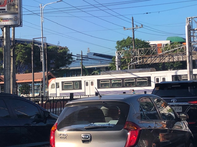 Commuter train crossing Espana Avenue towards the Espana Station of the PNR line
