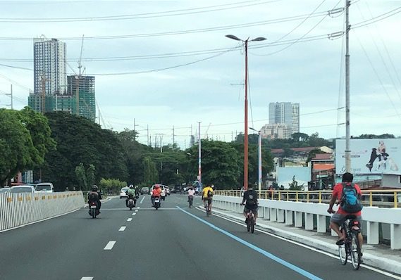 People biking to work along the Marcos Highway bridge’s painted bike lane