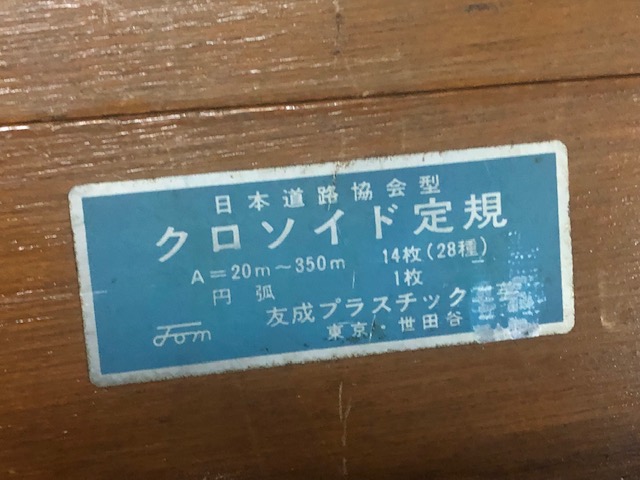 The sign basically translates to clothoid drawing tools made by a company based in Setagaya in Tokyo. There are 14 instruments in the box for clothoid parameter values of A = 20m to 350m.