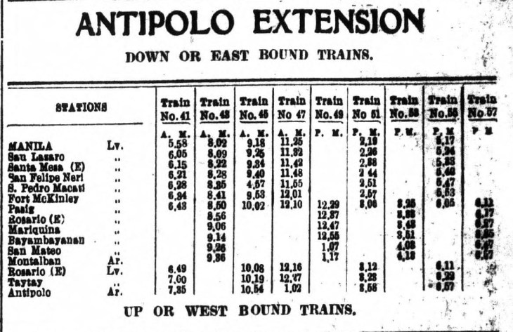 I found this on the internet – a timetable or schedule for trains bound for what are now destinations in Rizal (e.g., Antipolo, Taytay, San Mateo and Montalban). Pasig and Marikina used to be part of Rizal province with the capital at Pasig (thus, Kapitolyo).